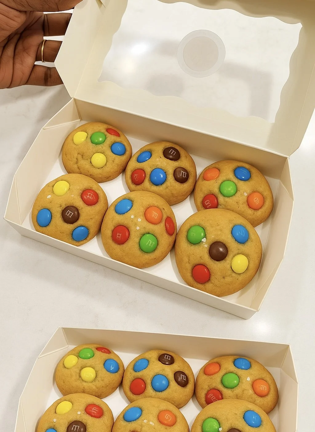 Stuffed red velvet $5.00 MnMs Cookie $5.00 Chocolate Chip cookie $4.00 S’mores Cookie $5.00 Dark Chocolate chip cookie $5.00 Kinder Chocolate Cookie $5.00 Dozen cookies (build your own) $40.00 Half Dozen (build your own) $21.00 Mini cookies box from $9.99
